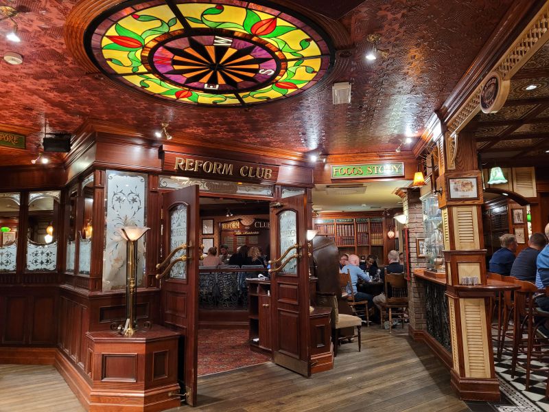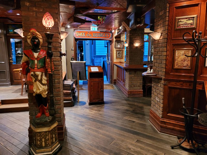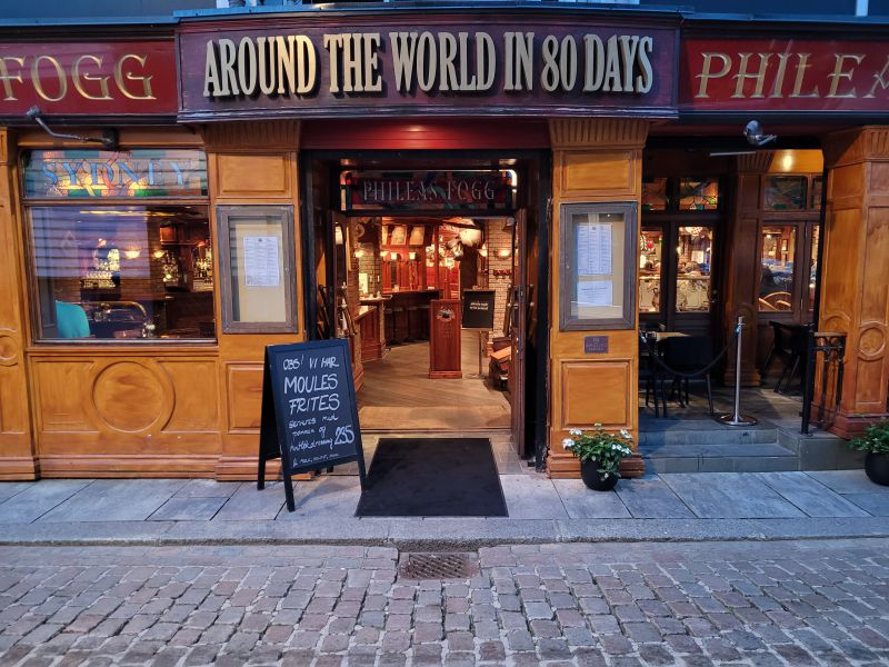 随后我们步行去逛市中心,没逛多久,我便被这个小城的美丽所迷惑。它远比我预想要漂亮和生动得多。此时我们已经饥肠辘辘,开始寻找餐厅。当然快餐店我们不想去,要吃一顿好的晚餐。我们一眼看上了港口鱼市场的餐厅Fisketorget Stavanger,不巧餐厅爆满,被告知没有预定就不可能今晚用餐了。又看了几家都是酒吧和快餐店。不知不觉来到一家装饰特别的餐厅前,抬首一看,上面赫然写着“80天环游世界”。这是一部名著小说,其作者是法国凡尔纳。故事是讲一个英国的富人菲利斯·福格(Phileas Fogg)同人打赌两万英镑,承诺在80天完成世界旅游。在此80天中他在世界多地经历了非同寻常的事情。由于提前没有做好功课,我们也不知道这家餐馆的好坏,现在又累又饿,于是决定就在这里吃了。