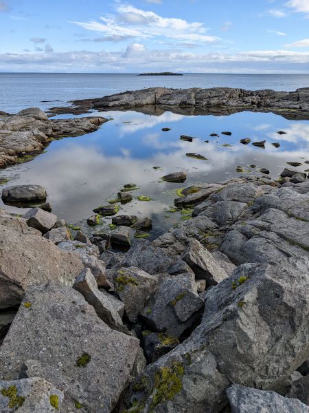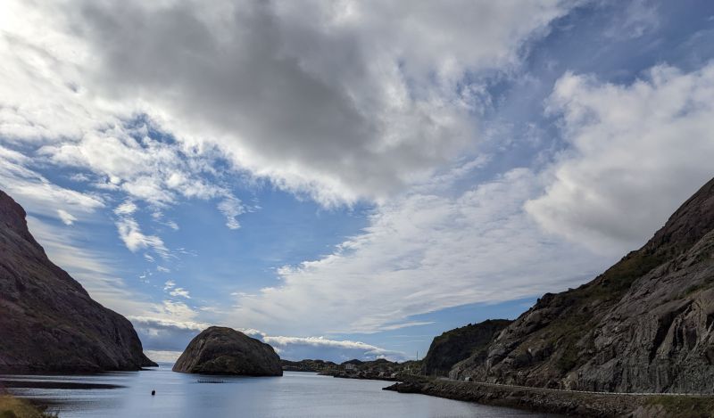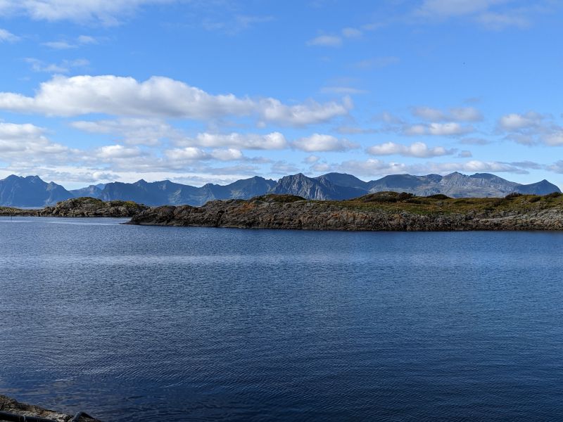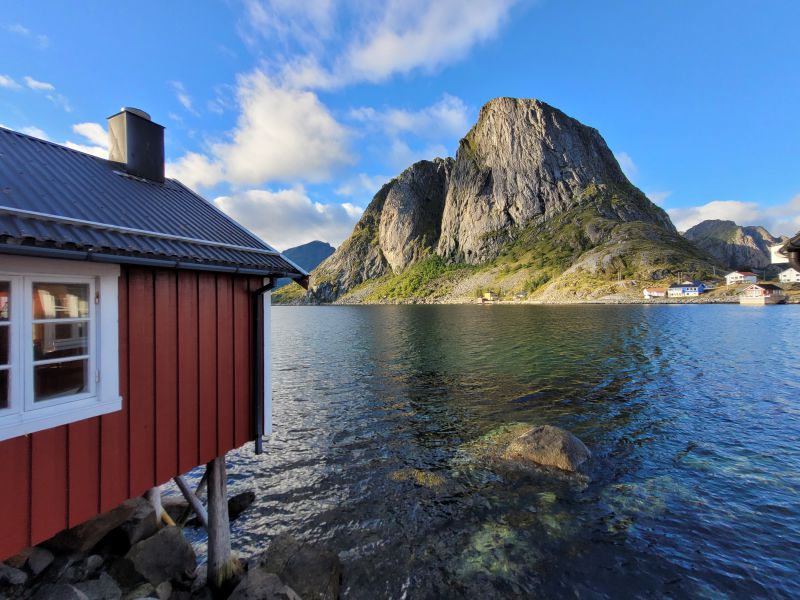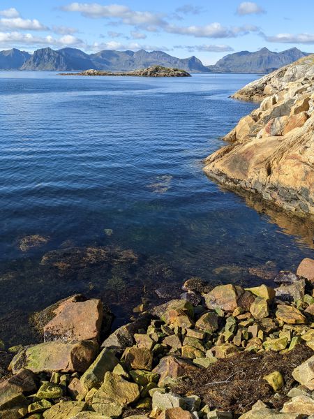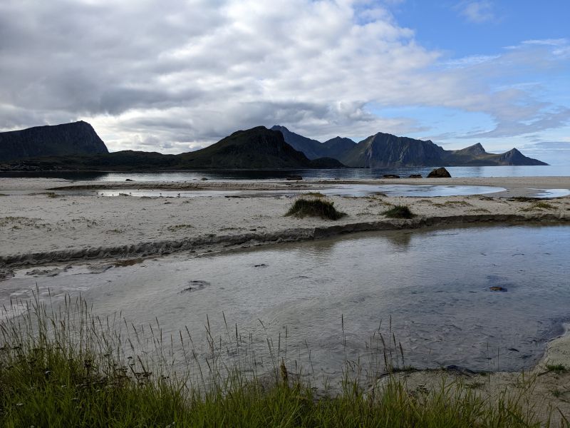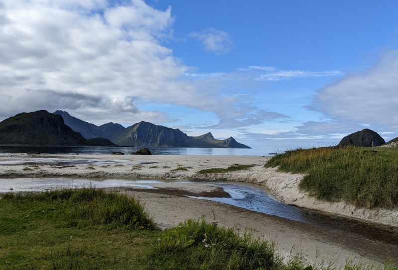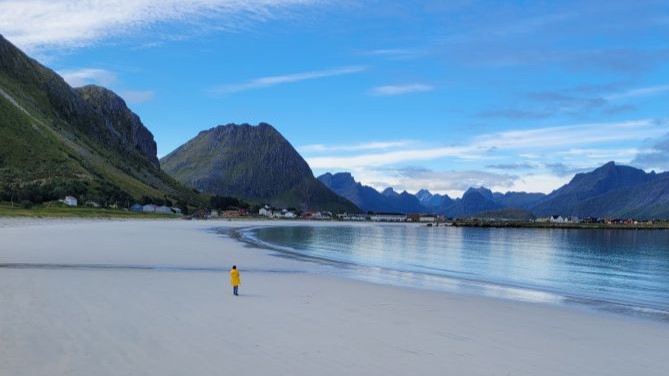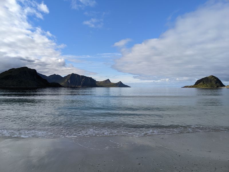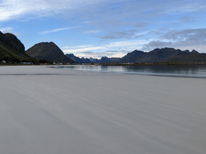 之后我们又去了努斯菲约德渔村,进村参观还需要买门票,就在周边转了转,因为没有什么特殊的景点,而罗弗敦岛上景色处处皆是,更不乏渔村。随后我们去了莱克内斯,从那里又去了一个非常美丽的沙滩—豪克兰沙滩。此沙滩上可见群山180度环抱海湾。海水碧蓝轻荡,长天云行无声,山峰静默伫立,海滩上只有我们带笑声的身影。我注意到岸边有不少人在这里宿营,有搭帐篷的,也有住房车的。