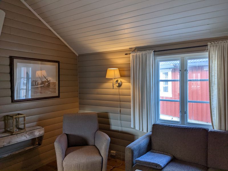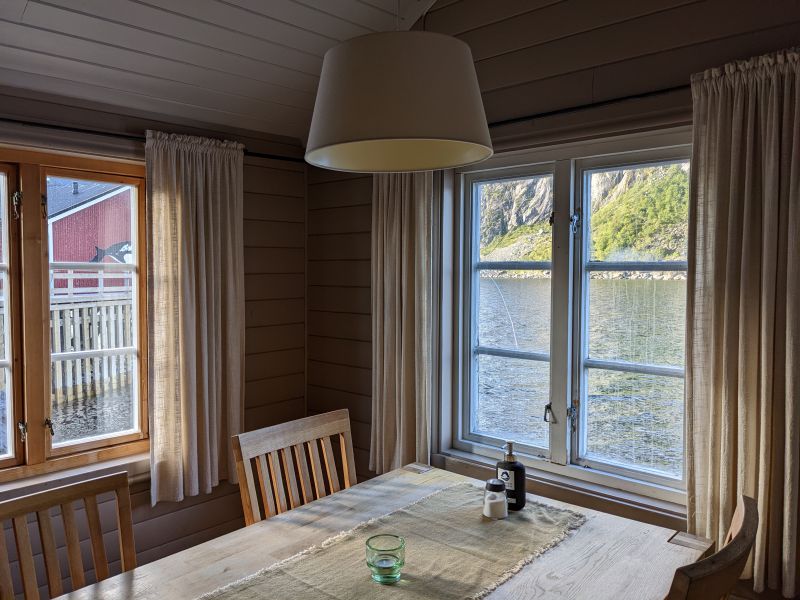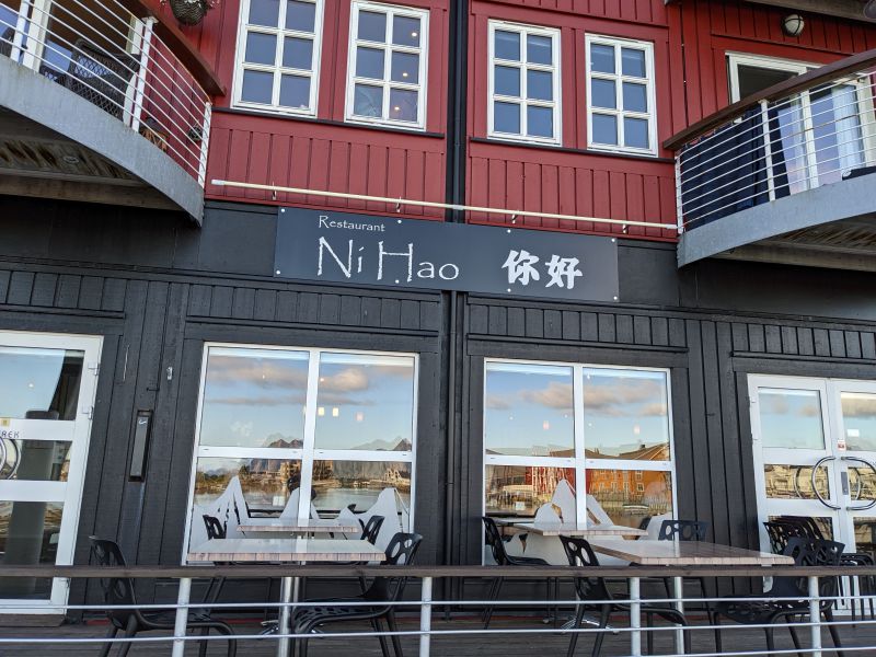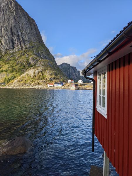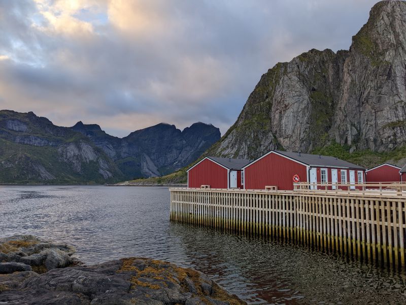 我们的住宿地方在哈姆馁伊Eliassen Rorbuer。此度假村里全是一色的深红小木屋,我们所下榻的那间隔水正对着如一块巨石般耸立的山峰。那正是人们经常在明信片或杂志上看到的那座山峰,其前面是海湾和红色的小木屋,在这里我真有身处明信片之中的感觉。我们在度假村徜徉了一阵便去村中的餐厅晚餐。点了鳕鱼,青口贝,还有鲸鱼肉,据说鲸鱼肉味道并不鲜美,所以烹饪时佐料特别的重,饭菜水平不错,侍应生是个比利时小伙,之前在比利时的著名的巧克力厂工作过好几年。