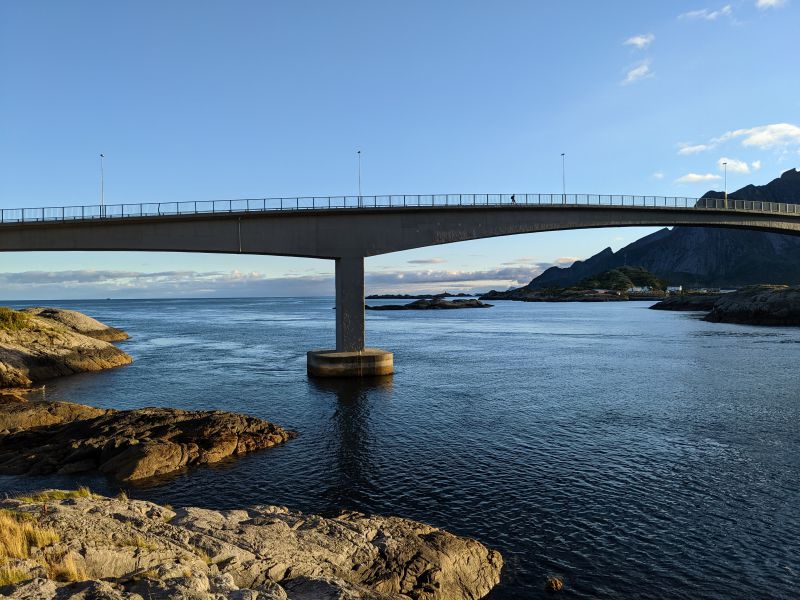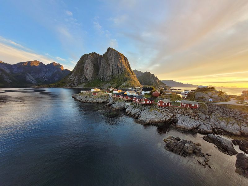 清晨我在海湾边霞光中醒来,从小木屋出来迎接即将升起的太阳。四处溜溜,满眼风光,我感叹大自然赋予罗弗敦群岛得天独厚美色。远远的望到哈姆馁伊桥上那几个意大利青年还在站立拍摄。后来我从他们脸书上得知,昨晚两点左右他们在桥上看到了极光,而我们由于了没有查看极光预告,错过了这次机会。这是我此次挪威猎诗之旅中错失的最大良机,一首美丽的诗漏网了,遗憾啊!其实夏末秋初不太容易看到极光。