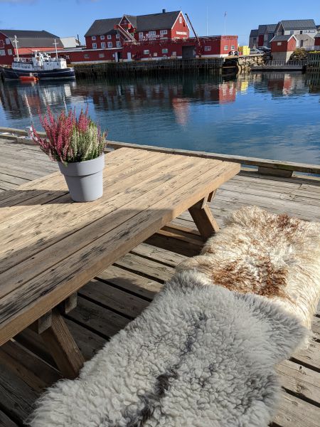 (罗弗敦画廊门前的露天长凳上铺着羊皮很保暖)