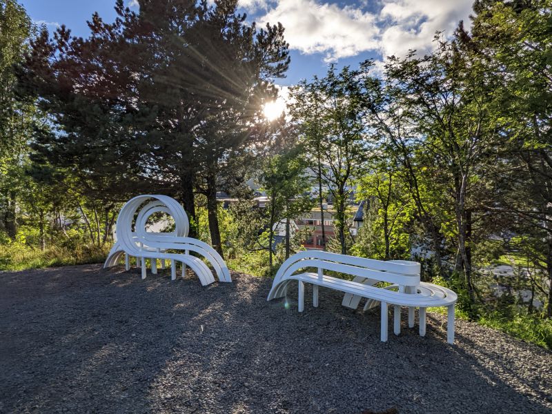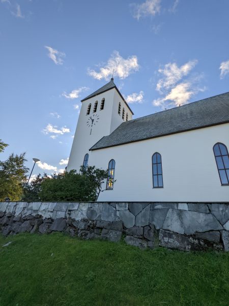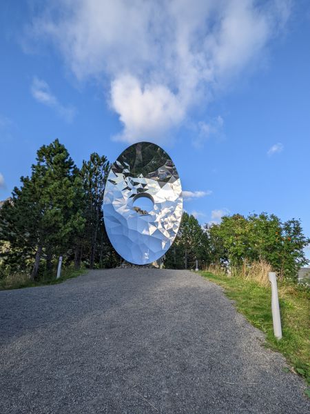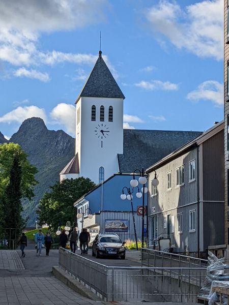 斯沃尔韦尔是罗弗敦岛上最大的一个城镇,原来只是一个小渔村,1800年才被允许游客在此留宿,后来这里慢慢变成一个交易的城镇。1996年挪威政府将它设定为一个城市,它的名字挪威语的意思是“寒冷的渔村”。这是一个非常漂亮的小城市,山峰奇特秀丽,海水碧蓝清澈。我们到达时天气极好,天晴而有云,拿起相机随便一照便是一张明信片。当然在罗弗敦群岛,许多地方都是如此,不足为奇。在码头转悠了一会儿,找到一家叫“你好”的中餐馆就餐,这家很正宗,老板是香港人,老板娘是成都人,饭菜相当不错。饭后我们又在城市里转了一阵,随后去参观了斯沃尔韦尔教堂,它的边上有一个公园,里面有一个雕塑叫做“北方之眼”,其形状像是一枚蓝色的宝石,中间有一个孔,人可以爬上孔内照相,效果挺有意思。