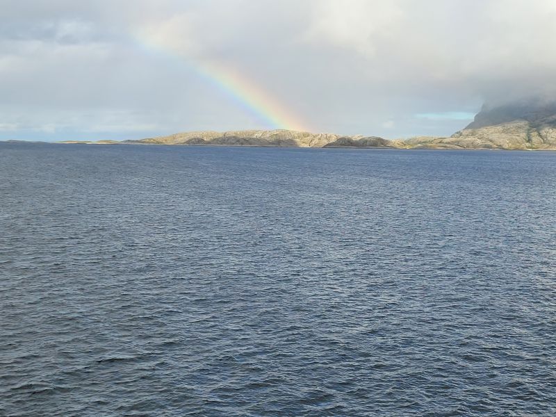 渡轮大概航行了三个多小时,途中海景还是非常不错的。望着远方的岛屿如海市蜃楼一般,我竟然又一次看到彩虹连接海天。当渡轮抵近罗弗敦群岛时,船上的人骚动起来,大家纷纷跑到甲板上摄像拍照,梦幻般仙山就在眼前从海中升起。