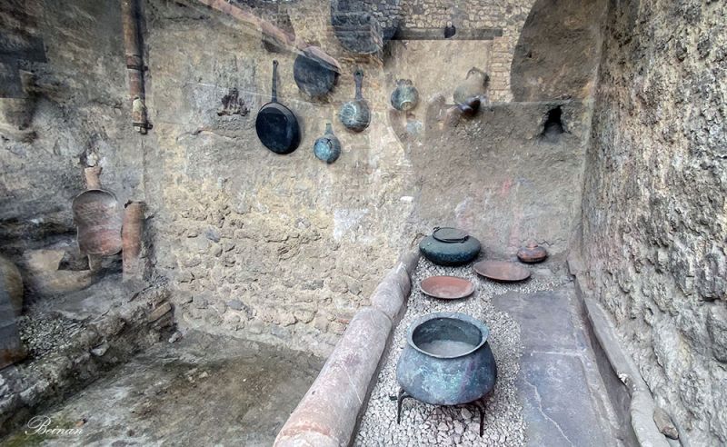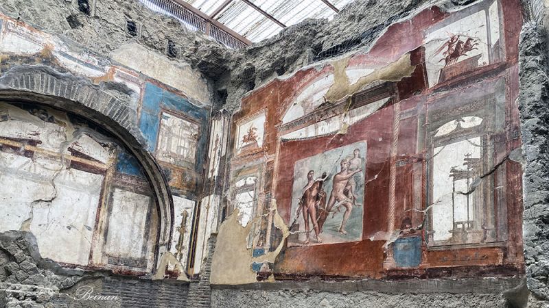 古物馆的说明上介绍,维苏威火山喷发的第一天下午,由于赫库兰尼姆位于维苏威火山以西,因此仅受到第一阶段喷发的轻微影响。所以有很多人带着贵重物品逃生,集中在靠海的一个船坞等待救援,但却被又一次火山的喷发吞灭。后来在那里发现了至少300人的骸骨。