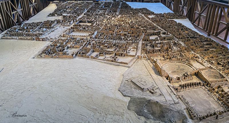 博物馆里有一个庞贝古城模型,展示现已挖掘出的古城部分。