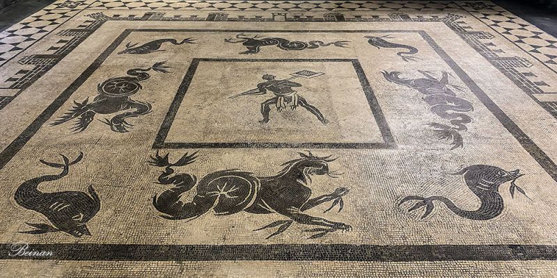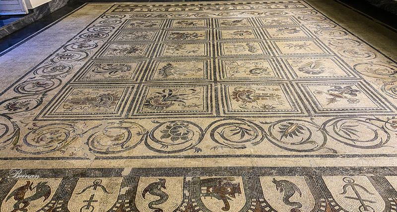 精致的马赛克地面呈现2千年前的精湛工艺。