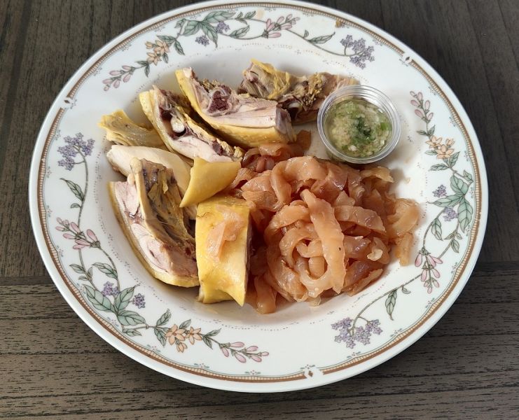 还有一小碟葱油酱料。味道不错,比上海1号的葱油鸡好吃多了。