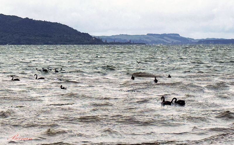从来没有看到过这么多的黑天鹅!导游告诉我们,罗托鲁瓦湖不仅是新西兰北岛最美的火山湖之一,也是黑天鹅的重要栖息地。黑天鹅原本是澳大利亚的鸟类,但在19世纪被引入新西兰,如今在全国湖泊和湿地广泛分布。