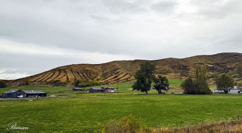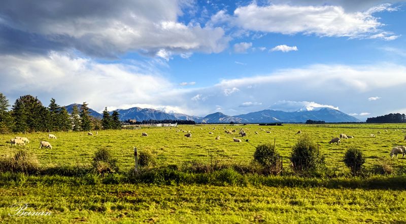 一会儿,又见一片翠绿的牧场和远处的树墙。连绵的群山,青翠或金黄的牧场,高耸的树墙,成群的绵羊……这是我们在新西兰常见的田园风光。