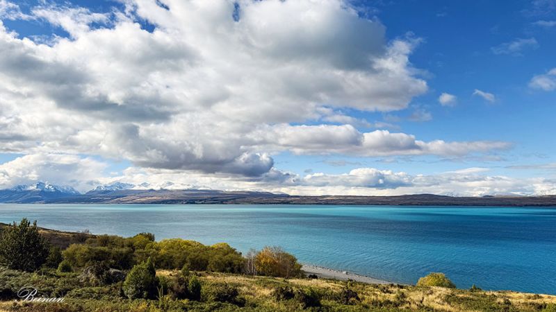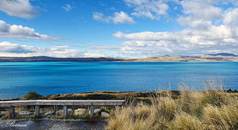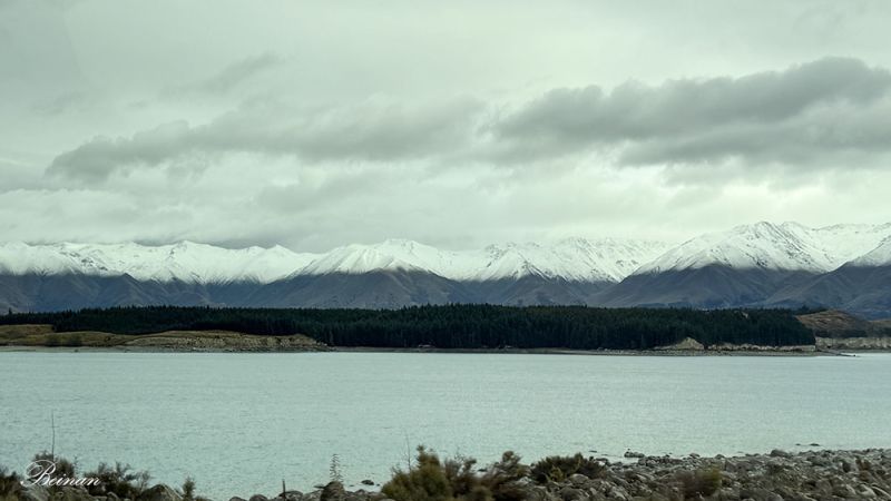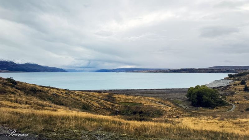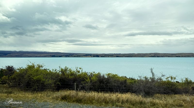 离开库克山国家公园,继续前行。旅游车停在彼得的瞭望台(Peter’s Lookout),我们再次看到普卡基湖。哇!和上午在雨蒙蒙的时刻看到的完全不同。湖水在云朵的遮掩下呈现出不同的颜色,分外迷人。