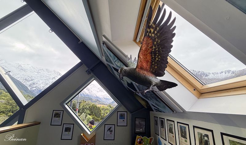 展翅高飞的高山鹦鹉Kea雕塑惟妙惟肖,好像能从窗户飞出去,奔向雪山。