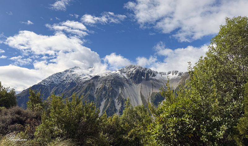 阴沉沉的天空乌云密布,却有一缕阳光穿透云层,正好洒落在库克山积雪皑皑的山顶,让我们一睹它的尊容。