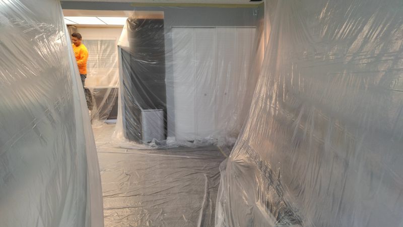 今天邻居中东老太太安排了南美大叔来给我们修补板岩(sheet rock):起居室(living room)、过道(hallway)、主卧室、主卧室卫浴室、客用卫浴室(Guest Bathroom)、厨房、后院储藏室(热水器室)所有被大割礼的天花板、墙板。