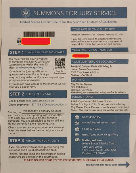 上集写的是2024年9月下旬,收到联邦法院北加州地区法院的‘陪审员应召通知’(Summons For Jury Service)。