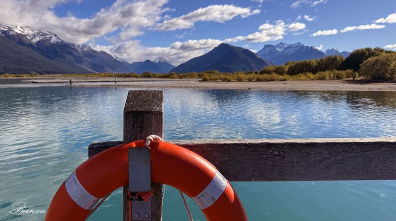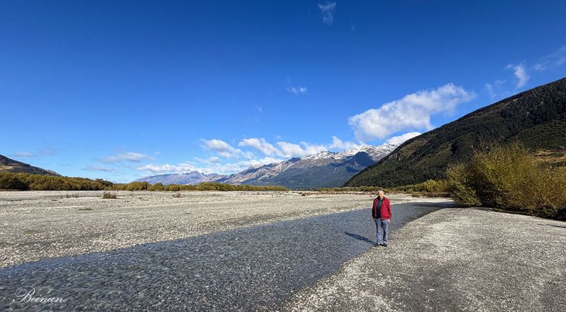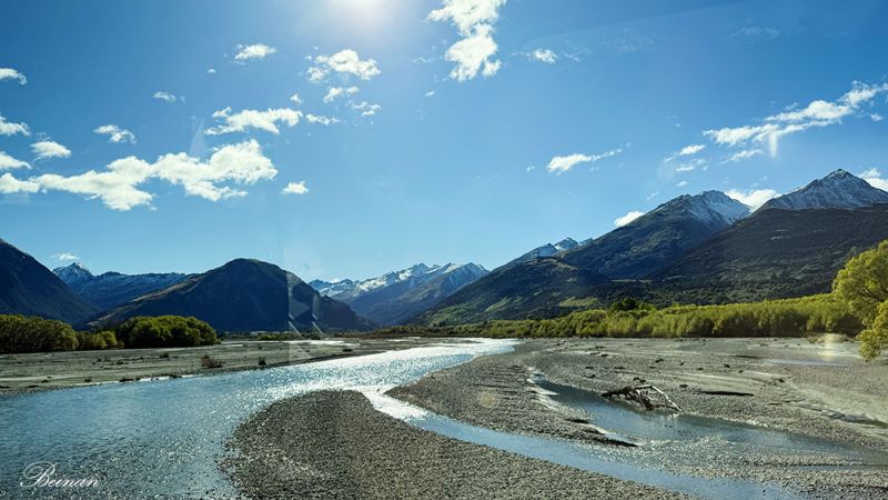 面前是一条巨大的冲积平原,里斯河(Rees River)在宽阔的河床上分流成无数条银色的水带,闪闪发光。四周群山环绕,远处白雪覆盖的厄恩斯劳山 (Mount Earnslaw)像一位巨人般矗立。