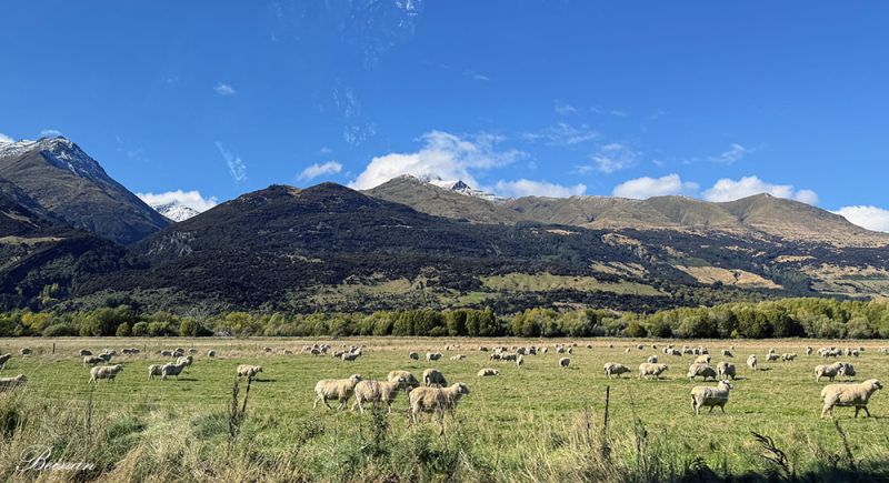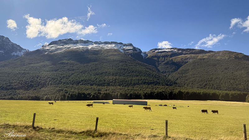 车子驶过狭长的大桥,继续在天堂之路(Road to Paradise)上前行。一路伴随的南阿尔卑斯山的白雪山峰,山脚下牧场上自由自在地羊儿们,使人感觉真的进入了天堂。