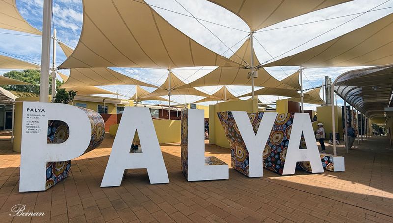 广场上,这几个大大的字母拼出来的词很有意思:PALYA。仔细看,第一个字母P上解释了这个词的发音和意思。Palya是原住民阿南古人使用的语言的一部分,意思是,你好(Hello),再见(Goodbye),谢谢(Thank you),欢迎(Welcome)。有意思吧?在这里,只要记住这一个词Palya,就够用啦。