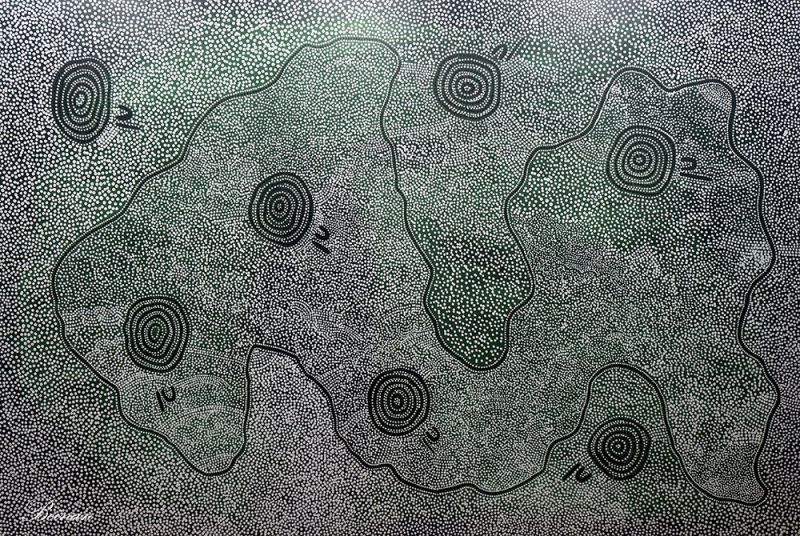大厅里的这幅画引起了我的注意。后来这里的导游讲过,在阿南古等中澳原住民的绘画中,最常见的图案就是一个或多个同心圆。这是他们的风格与象征语言。同心圆代表祖灵停留的水源地,蜿蜒的线条象征连接这些圣地的梦幻之路。白色的点绘描绘出沙漠在雨季复苏的景象。作品表达了阿南古人与土地、雨水及祖先之间的永恒联系。真是太神奇啦!