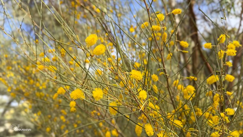度假村里有很多以前没有看到过的植物和树木。最喜欢的是这棵开着黄绒花的树。