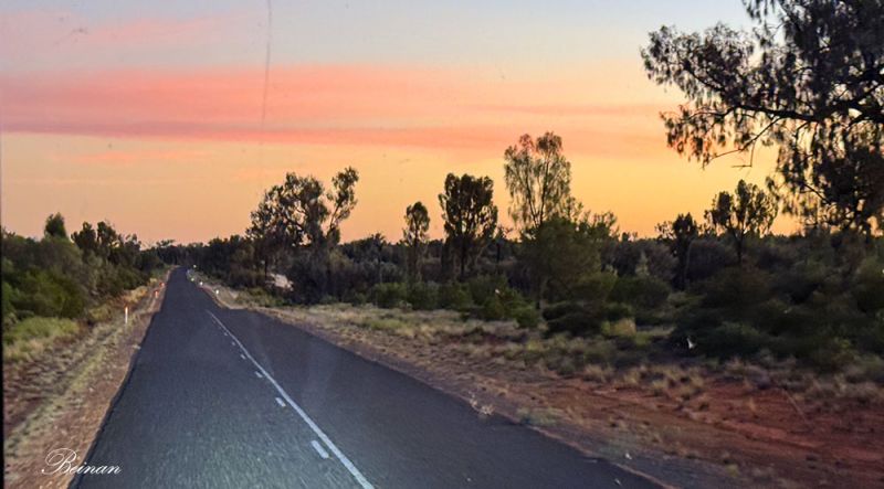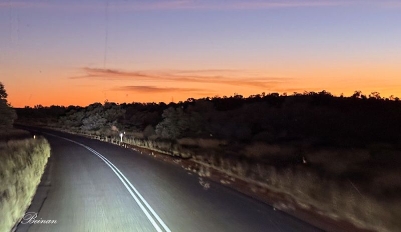 澳大利亚的中部虽然人烟稀少,但公路修的特别好。太阳还未升起,天边已是一片橘红。