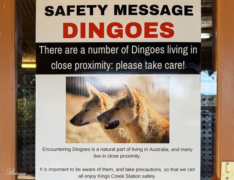 大门口有下面这样的警告牌,导游也讲了注意事项。Dingoes是澳洲野狗,是澳大利亚最具代表性的野生动物之一。澳洲野狗的外形介于家犬与狼之间。它们在附近生存,有一定的危险性。但是我们没有看到它们,有点遗憾。
