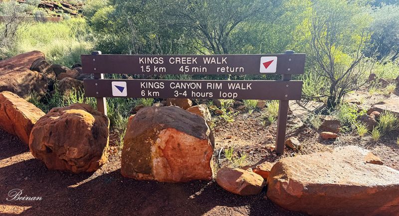 来到国王峡谷。这个路标上有两条路:一条是国王溪步行,1.5公里,来回45分钟;另一条是国王峡谷边缘行,6公里,走一圈约3-4个小时。