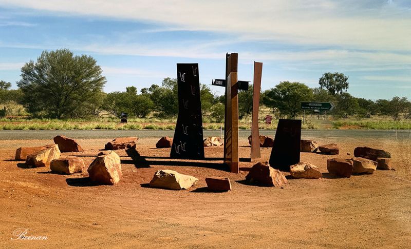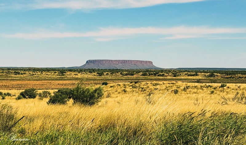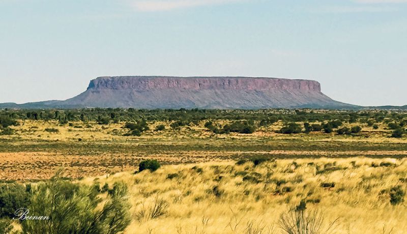 司机再次将车停到公路边。我们一下车,就看到了这一景。这不是乌鲁鲁巨石嘛!我们都说。可是导游说这不是乌鲁鲁,是康纳山(Mt Conner),距离乌鲁鲁约100公里的东边。