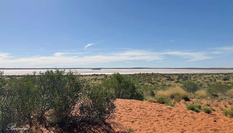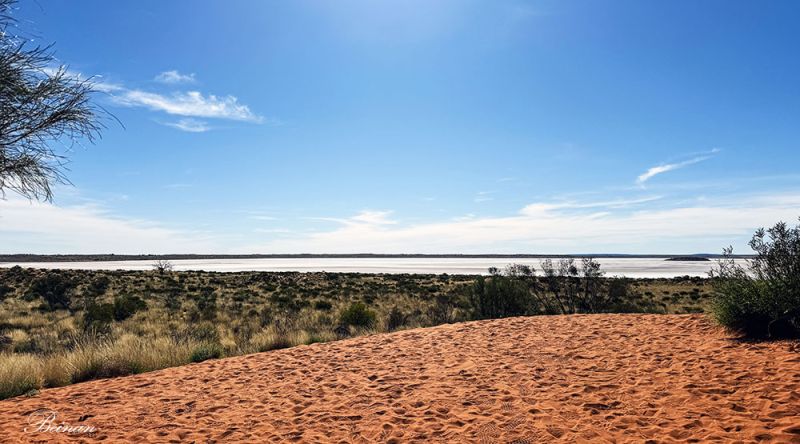 穿过公路,爬上一道沙丘,一片白色的盐湖展现在眼前。这是阿马迪厄斯湖(Lake Amadeus)。它是北领地最大的盐湖,长约180公里,宽约10公里。盐层厚度在某些地段可达几米。