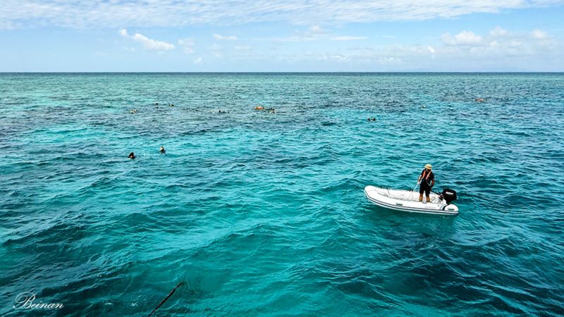两个多小时后,我们终于到达可以浮潜的海域。船上的人都换上浮潜服,戴好浮潜设备,准备下海。