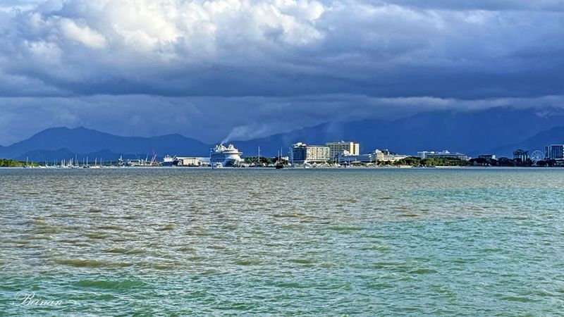 渐渐地,远方出现了一条淡淡的影子。最初只是天与海之间的一抹深绿色,随后那影子越来越清晰,那是凯恩斯背后的山。那些山像巨大的屏障一样矗立在城市背后,给人一种被热带大地拥抱着的感觉。