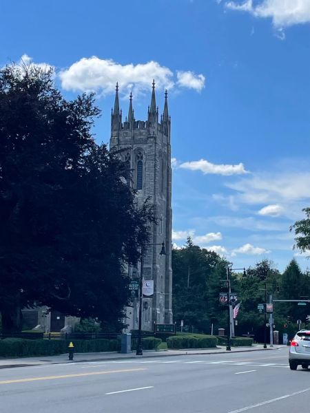 教区建筑覆地广 直角相交两街长 庭院塑像连学校 主体突出大教堂