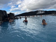 自带浴巾或者1100克朗租。里面水免费,其他饮料可以随时买。每人一个储物柜,厕所洗浴间齐全。太阳一开始没有出来,风比较凉,下水前有些冷。不过泡了两个小时左右,全程相当舒服,温泉外街湖水,远处有熔岩和火山地貌相连,景色独特,世上绝无仅有。太阳从白云后洒下万道光芒,眷顾着温泉池中的游客,交杯换盏,高谈阔论,亦或躺坐在边上昏昏欲睡,说不出的惬意自在。