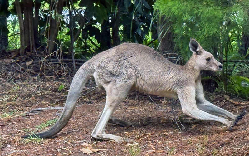 我们在澳大利亚多次看到野生袋鼠,但是大都是小袋鼠(Wallaby),看到的大型袋鼠也是远距离。这是我第一次这样近距离地看到大型袋鼠,并且抓住了它在车边奔跑的瞬间,很是兴奋。