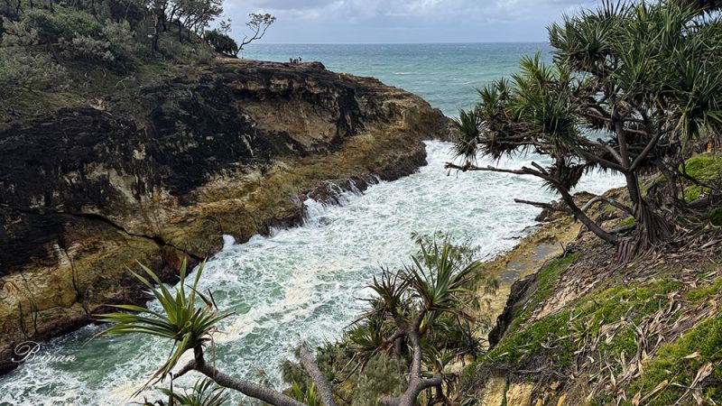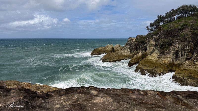 站在瞭望角(Point Lookout)上,太平洋在脚下无边无际地展开。海面一层层起伏,白浪闪耀着银光,从远处整齐地推进,一排又一排地拍向金色的沙滩。浪花在岸边翻滚成白色的泡沫,风裹着海盐的气息呼啸而来,带着微微的凉意。