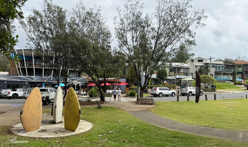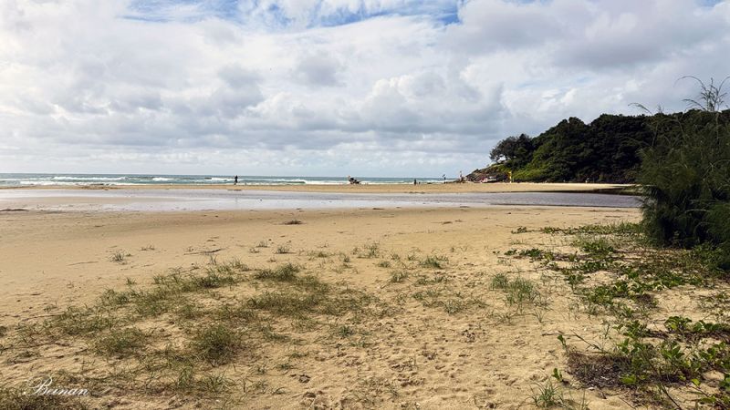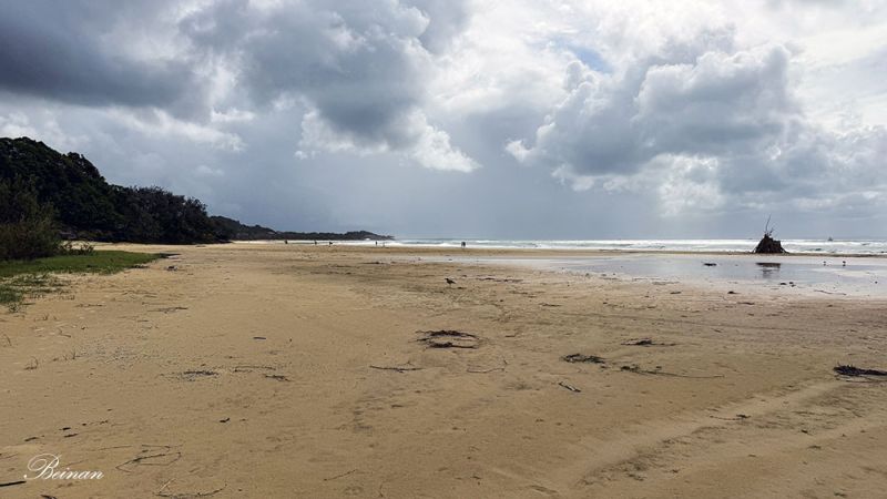 大雨终于停了。我们从瞭望角小镇步行几分钟,就到了圆柱海滩(Cylinder Beach)。这是一片弧形的金色沙滩,像半月一样环抱着碧蓝的海水。