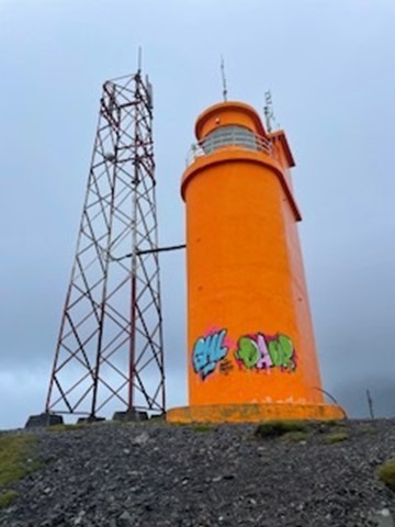 华内斯灯塔(Hvalnes lighthouse):五点半到时,风大到吹得人都站不稳打。等他的橘黄色十分醒目,阿碧没有下车,若谷吹了海风,后来的感冒可能与此有关。 另一辆白车停下,但很明智没人下来。