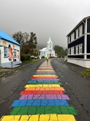 邻近欧洲大陆的关系,镇上拥有不少挪威风格的木制房屋,色彩缤纷的建筑也是特色之一,美丽的蓝色城镇教堂(blue church)前,以彩虹街(哈夫纳加塔)步道而闻名,这是一个充满活力的社区艺术项目,包括在街道上绘制彩虹,彩虹步道象征着该镇的创造力和热情好客的氛围。这条色彩缤纷的小路通往标志性的蓝色教堂,淡蓝色在微风细雨中安详地接受游人的注目礼。