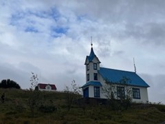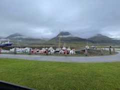 斯托瓦菲厄泽(Stöðvarfjörður):一个沿海小村庄,坐落在以其名字命名的峡湾北侧。村子人口约200人。曾主要依靠冰岛东部繁荣的渔场,但与许多小村庄一样,随着20世纪70年代现代渔业改革席卷全国,渔场的繁荣开始衰落。如今,该村的经济主要依靠纺织业和旅游业。佩特拉石头收藏(petra's stone collection)就是其中一个景点,每年吸引着众多游客来到这个偏远的沿海村庄。车停到佩特拉对面的水边上,没去看石头,吃了自带的可乐鸡翅,径直朝山坡上的蓝色教堂走去。山坡上面的游人显然比下面多。虽然不是晴天,但景色甚佳。