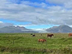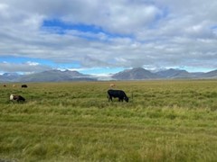 蓝天白云下,羊儿三五成群活泼灵动, 马儿丰姿卓然,牛儿憨态可掬, 众冰川一路联袂相伴,宛如迎风展开的画卷,令人目不暇接。