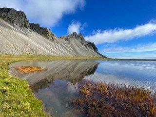 早晨在霍芬旅馆旁的步道上走走, 早晨的海边清新宁静。由于前一天没来得及去, 一大早儿行程半小时去Stokksnes(史托克角),冰岛东南部的一座岬角半岛,连接着冰岛南岸与东部峡湾两大景区,与杰古沙龙冰河湖(Jökulsárlón)与瓦特纳冰川国家公园(Vatnajökull)相距不远。冰岛最著名、最受摄影师青睐的山峰之一:西角山(Vestrahorn),海拔约为454米,似汉字的“山”字一般棱角分明,山顶的嶙峋尖角错落有致,山脚下还栖息着宁静的湖泊,西角山因造型独特,又名“蝙蝠山”;天光山影倒映入湖面的绝景无比动人,故而又有人称其为“倒影山”、“天空之镜”。