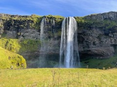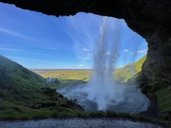 几经商讨没有去看飞机残骸。沿一号公路南下终于到黄金圈,一个小时后先冰岛南岸最著名的两大瀑布之一斯科加瀑布(Skogafoss),另一个是15分钟车程外的塞里雅兰瀑布(Seljalandsfoss)。两座瀑布的高度相仿,却形态各异,各具美态。塞里雅兰瀑布是冰岛少数可以穿行的瀑布;而斯科加瀑布则相传藏着远古海盗的宝藏。