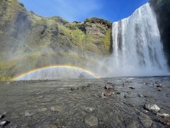 斯科加瀑布位于平原之上,水幕宽阔,瀑流激荡,激起迷蒙的水雾在阳光下升起的彩虹乃至双彩虹给人不凡的视觉享受,天随人愿,倒影也超乎想象的美妙。苹果没能完美捕捉那个圆满的瞬间,微风袭来,涟漪中彩虹的倒影随之破碎。