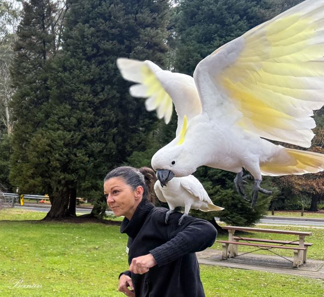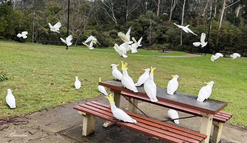 后来,我们在蓝山地区的城镇、餐馆、停车场等地方多次看到硫冠凤头鹦鹉。它们真的是这个地方最常见的鸟。