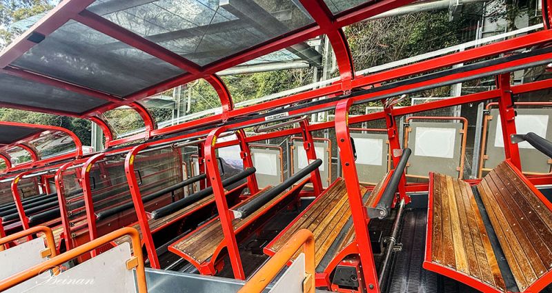 车厢缓慢下滑,感觉几乎是站立在车厢里,多亏系了安全带,才不担心冲出车厢外。眼前是陡峭岩壁与雨林树冠,刺激却安全。