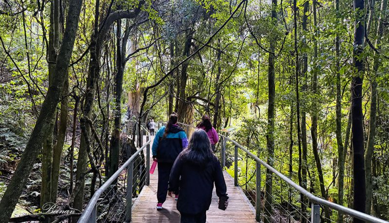 接着,我们走上谷底的木栈道,穿过灌木丛,蕨类、苔藓和古老桉树环绕的雨林。