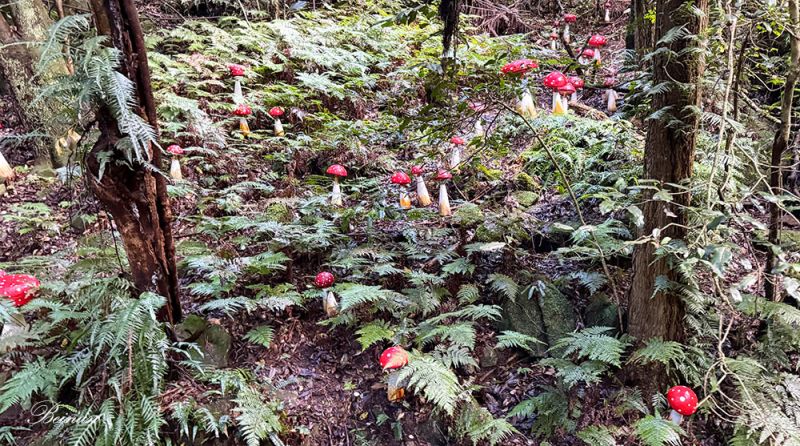 突然,步道两边出现了很多红色的蘑菇,像小小的火焰,点缀在苔藓和落叶之间。仔细一看,原来是假的。不过也让老太有了瞬间奇幻的感觉。