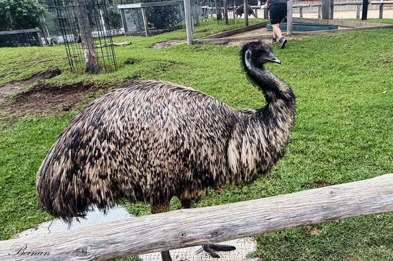 在这里看到了鸸鹋(Emu)(读ér miáo)。它是澳大利亚特有的大型不会飞的鸟类,也是澳洲标志性动物之一,仅次于袋鼠的体型。它们高大健壮,成年鸸鹋身高可达1.9米,羽毛呈灰褐色,蓬松而柔软,腿长有力,非常适合奔跑。这也是在野外很难看到的大鸟。
