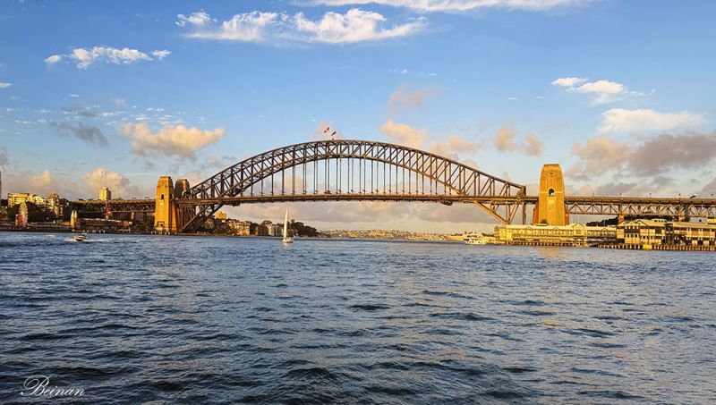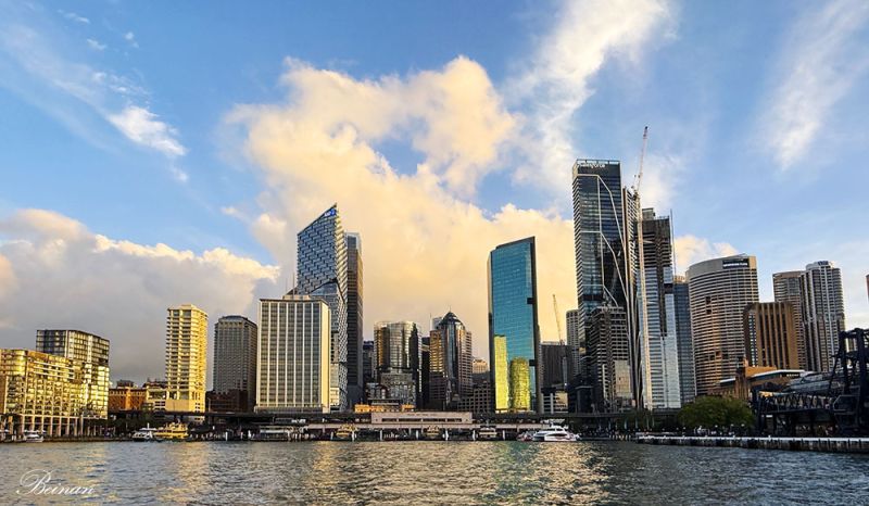 渡轮驶入环形码头,港口两岸的高楼大厦在斜阳下泛着温暖的光,玻璃幕墙反射着金色的光芒,仿佛在向我们微笑欢迎, 又好像在默默挥手告别----这是我们在悉尼,也是澳大利亚的最后一天。