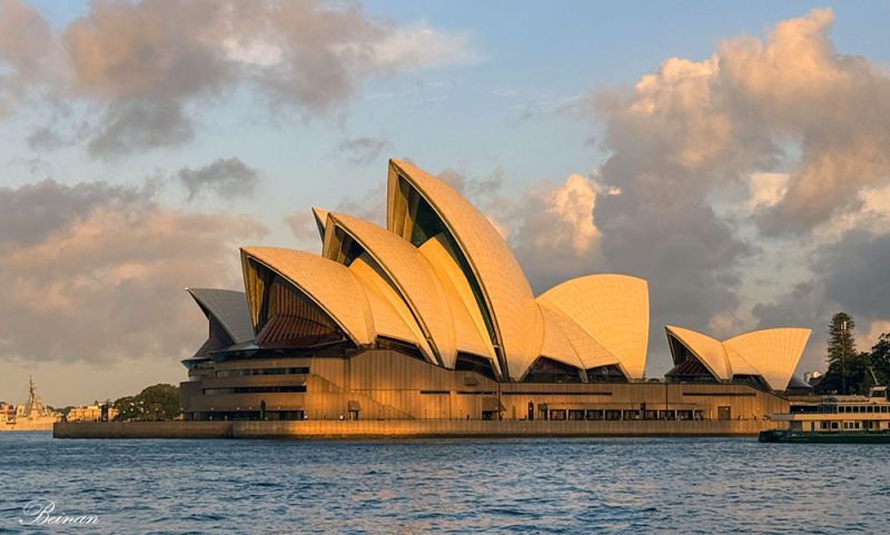 斜阳轻轻倾洒在悉尼歌剧院(Opera House)的屋顶上,白色的帆船曲面被染成柔和的金色与橙色,光影在弧线间流淌,温暖而宁静。
