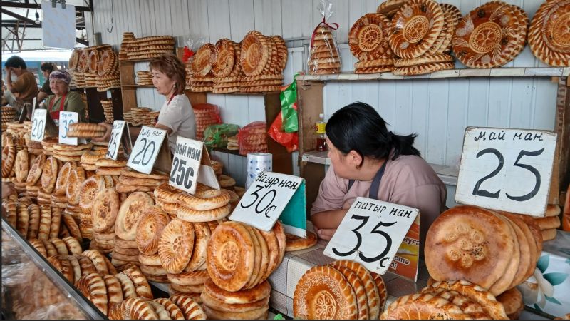 下午开始行程,导游是一个年轻的小伙子。人比较腼腆,英语不是很好,人还是不错的。第一个景点是奥什大巴扎(集市)。琳琅满目的商品包括堆成小山的香料、干果、糖果,悬挂着的各式传统毡帽,以及新鲜的牛羊肉区。在这里我第一次尝试了马肉香肠。马肉在此国是很平常的。5个斯坦中的4个都是如此,只有土库曼斯坦不吃马肉。给我印象极深的是大大小小的面包,上面带着花纹图案,像是工艺品。在这里,你可以与友善的商贩讨价还价,品尝街头小吃(比如刚出炉的萨姆萨),真正融入当地人的日常生活。这里像是一座活生生的民俗博物馆。
